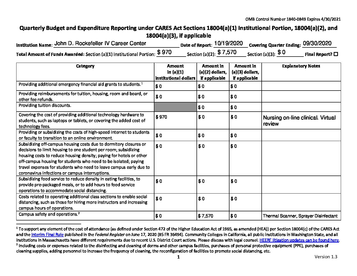 On Friday, March 27, 2020, the Coronavirus Aid, Relief and Economic Security (CARES) Act, a $2 trillion relief package, was signed into law. The CARES Act has provided funding to colleges, career center and universities to assist students during the global crisis. On May 13, 2020 John D. Rockefeller IV Career Center signed and returned to the Department of Education the Certification and Agreement committing intent to use no less than 50% of the funds received under Section 18004(a)(1) of the CARES Act to provide Emergency Financial Aid Grants to students. As a result, on May 28th 2020 JDRCC received $7,570.00 to assist students to cover the cost of expenses incurred as a result of COVID-19.